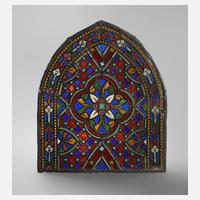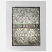 2. Hälfte 19. Jh., feiner ornamentaler Dekor aus handdekoriertem Farbglas, Einfassung mit Wandaufhängung, guter Zustand, Maße 86 x 75 cm.
