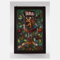Ende 19. Jh., Farb- und Ornamentglas, teils farbig bemalt und mit Schwarzlot verziert, bekröntes Wappen mit lateinischem Schriftband, vereinzelte kleine Risse, sonst gut erhalten, in altem Holzrahmen, mit Aufhängung, Maße 89 x 62 cm.