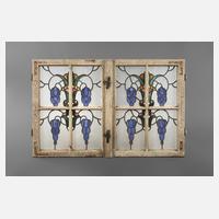 um 1920, zweiflügelig, farbenfrohes stilisiertes Traubenmotiv, zwei Scheiben gerissen, Maße 53 x 56 cm.