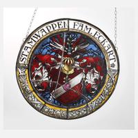 19. Jh., Tondo aus Farb- und Ornamentglas, teils aufwendig bemalt, mit Umschrift Stammwappen Fam. Eckart, zentrales Motiv mit Eichenlaub verzierte und von Harnisch bekröntes Familienwappen, Altersspuren, an Gliederkette abgehängt, D 27 cm.