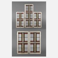 1930er Jahre, bestehend aus zwei Paar Fensterflügeln sowie einem großen Oberlicht, geometrischer Dekor aus Farbglas und weißem Milchglas, rissfreier Zustand, teilweise Farbreste, Maße viermal 118 x 62 cm, einmal 177 x 65 cm.