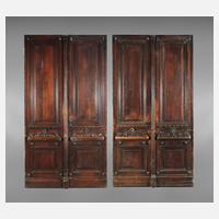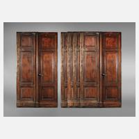 Eiche massiv, dunkelbraun gebeizt, um 1900, zweiflügelige Türen mit je drei Kassettenfüllungen, die Rückseiten teilweise weiß gestrichen, Türklinken nicht komplett, restaurierungsbedürftig, Maße 252 x 137 cm.