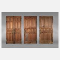 deutsch, um 1890, Eiche massiv, bestehend aus großer zweiflügeliger Tür, mit originalen Messingbeschlägen, fein geschnitzte Kassettenfüllungen, originales Schloss und Beschläge, Türklinke fehlt, dazu zwei einflügelige große Türblätter, diese zum Teil beschädigt, die Rückseiten weiß gestrichen, restaurierungsbedürftig, Maße 252 x 137 cm, Maße Zimmertüren 237 x 112 cm.