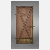 Anfang 19. Jh., schlichtes, mit Eisenblech beschlagenes Türblatt, die Außenseite mit genieteter Kreuzverstrebung, Blech im Sockelbereich durchgerostet, restaurierungsbedürftig, Maße 200 x 97 cm.