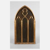 2. Hälfte 19. Jh., gotisches Knotenmotiv aus Farb- und Klarglas, partiell in Schwarzlot gemalt, im späteren Eisenrahmen mit Aufhängung gefasst, vereinzelte Segmente mit Haarriss, Maße 94 x 69 cm.