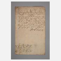 Markgraf und Kurfürst zu Brandenburg (1688 Cölln bis 1740 Potsdam), dem legendären “Soldatenkönig” und Vater Friedrich des Großen an den General-Leutnant von Marwitz, “... Ich habe aus Eurem Schreiben vom 30. d. Junie und der monathl. Liste ersehen daß bey Eurem Regiment noch alles in guten Zustande ist. Es ist mir solches lieb und ich verharre - Euer wohlaffectionierter [wohlwollender] König ...”., bei dem Adressaten handelt es sich wohl um den Generalmajor Heinrich Karl von der Marwitz (1680 Sellin bis 1744 Breslau), ab 1720 Mitglied des preußischen Tabakskollegiums des Soldatenkönigs und ab 1724 Chef des Altpreußischen Infanterieregiments “von Dönhoff” in Halberstadt, 1739 zum Ritter des “Schwarzen Adlerordens” ernannt, gegeben am 4. Juni 1738 in Potsdam und vom König unterzeichnet, altersgemäßer Zustand auf Bütten, Maße 20 x 23 cm.