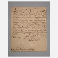 genannt “Der Große” von Preußen, ab 31. Mai 1740 König in Preußen, ab 1772 König von Preußen (1712 Berlin bis 1786 Potsdam) an den General-Leutnant von Marwitz, “Mein lieber General von der Infanterie von Marwitz. Nachdem ich resolvieret [beschlossen] habe, das Möllendorfsche Regiment ... nach geschehener Revue und wenn die Erndte vorbey sein wird, Dergestalt nach Oberschlesien zu verlegen wie Ihr aus der deshalb abschriftlich ergangenen Ordre ersehen ...,, so habe Ich Euch solches zur Nachricht und Achtung hierdurch bekannt machen wollen ... “, bei dem Adressaten handelt es sich wohl um den Generalmajor Heinrich Karl von der Marwitz (1680 Sellin bis 1744 Breslau), ab 1720 Mitglied des preußischen Tabakskollegiums des Soldatenkönigs und ab 1724 Chef des Altpreußischen Infanterieregiments “von Dönhoff” in Halberstadt, 1739 zum Ritter des “Schwarzen Adlerordens” ernannt, gegeben am 4. Juni 1743 in Berlin und vom König unterzeichnet, altersgemäßer Zustand auf Bütten, Maße 19 x 24 cm.