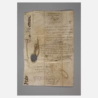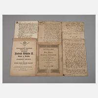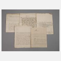Heiratsbrief vom Kloster Niederaltaich, auf Bütten, vom 23. Oktober 1801; Übergabevertrag von 16000 Gulden im Namen seiner Majestät des Königs von Bayern, auf Bütten vom 10. August 1863; Urkunde der königlichen Regierung von Oberbayern, auf Bütten von 1846; zwei königliche Urkunden Isarkreis und Rosenheim, auf Bütten von 1825 und 1829 sowie die Abschrift eines Kaufvertrages, auf Bütten um 1850, altersgemäßer Zustand, Maße ca. 21 x 35 cm.