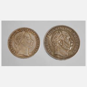 1871 A, Siegestaler Preußen, Avers Wilhelm König von Preußen, Kopf nach rechts, Revers sitzende gekrönte Frau mit Schwert, fast vz; dazu 1 Florin 1859 A, Österreich Ungarn, Avers Franz Joseph I., Kopf nach rechts, Revers der Doppeladler, vz.