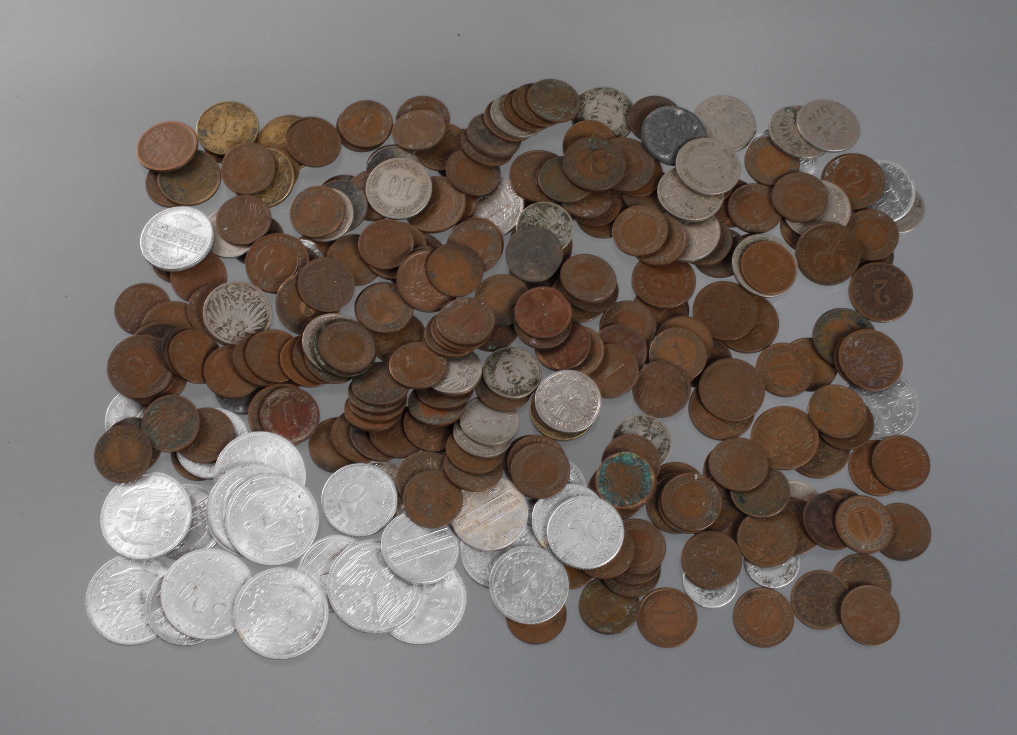 ca. 250 Kleinmünzen zu 1, 2, 5, 10, 25 und 50 Pfennig, sowie 200 und 500 Mark, Kaiserreich, Inflation und 3. Reich alle in Umlauferhaltung.
