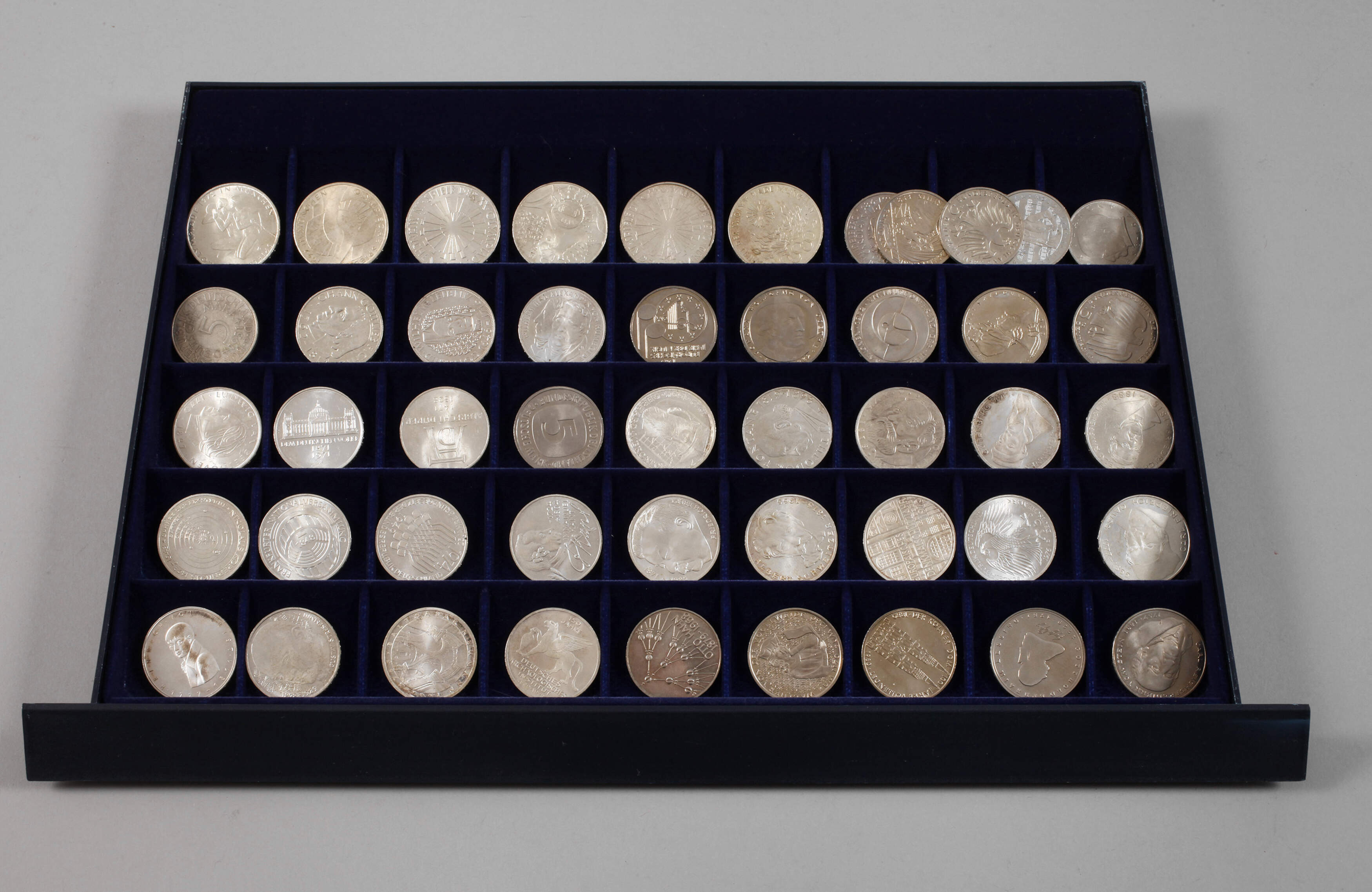 sechsmal 10 DM Olympiade 1972 sowie 42-mal 5 DM, darunter Fichte, Leibniz, Humboldt, Fontane, Beethoven etc., vorwiegend Silber, bei den 5 DM Stücken auch einige Kupfer-Nickel dabei, meist vz, in Sammelbox, Maße 26 x 38 cm.