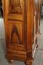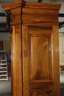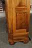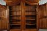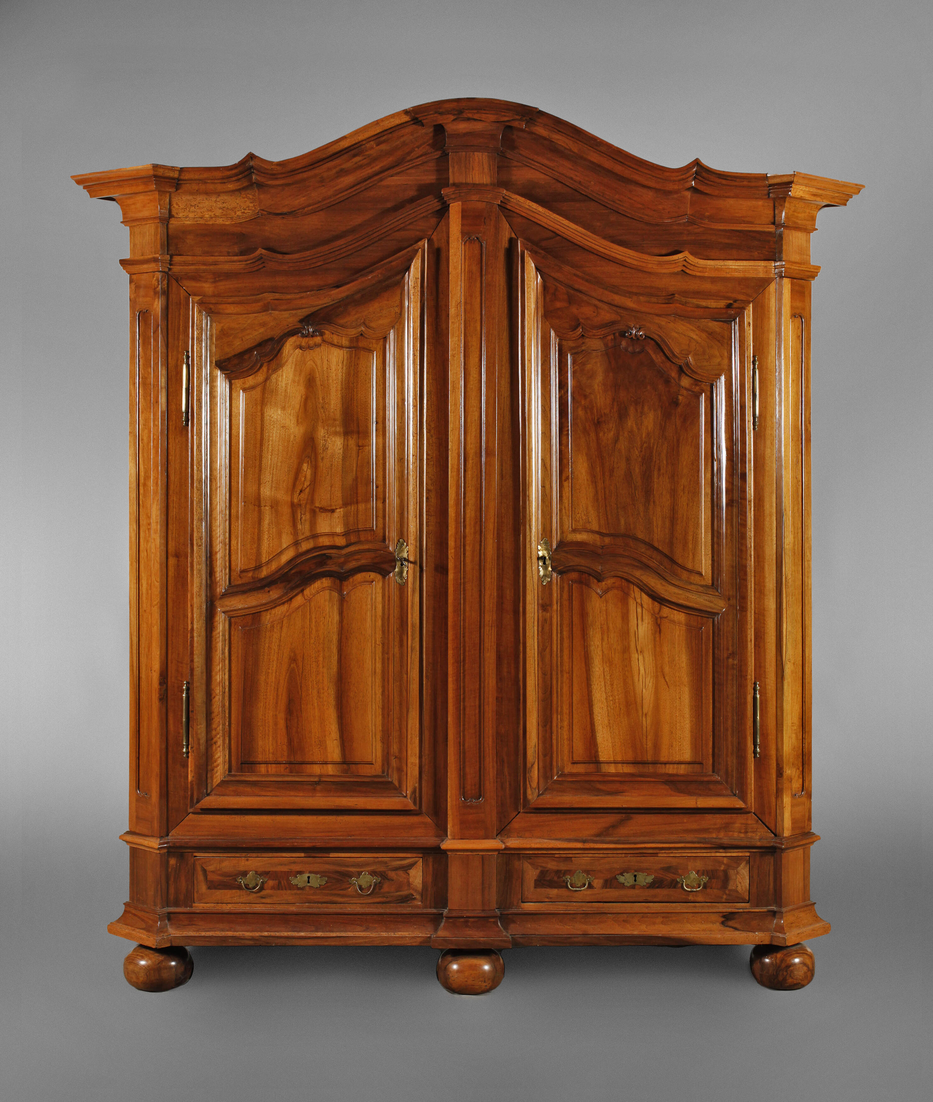 Nussbaum massiv, Mitte 18. Jh., zerlegbarer zweitüriger Schrank mit außenliegenden Schubkästen, die Türen mit geschnitzten Füllungen, die oberen Profile mit Voluten und Muschelmotiv, originales Schloss, Schlüssel und Beschläge, Schloss mit zwei Zuhaltungen, innen mit vier später eingesetzten Regalböden, wohnfertig restauriert, Maße 248 x 220 x 80 cm.