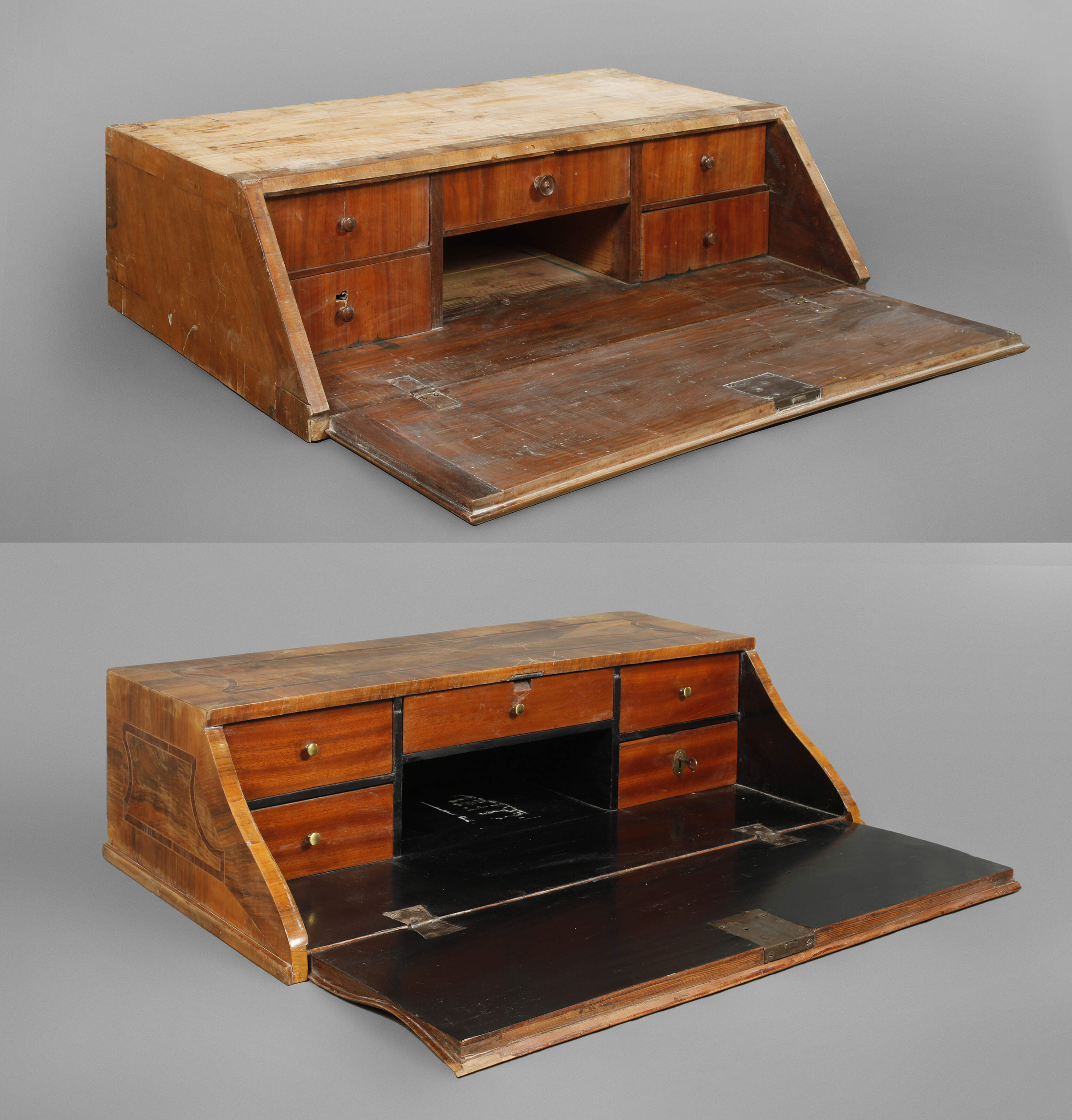 Nussbaum auf Nadelholz furniert, 2. Hälfte 18. Jh., beide mit Innenleben, restaurierungsbedürftig, Maße 27 x 96 x 55 und 26 x 106 x 58 cm.