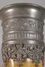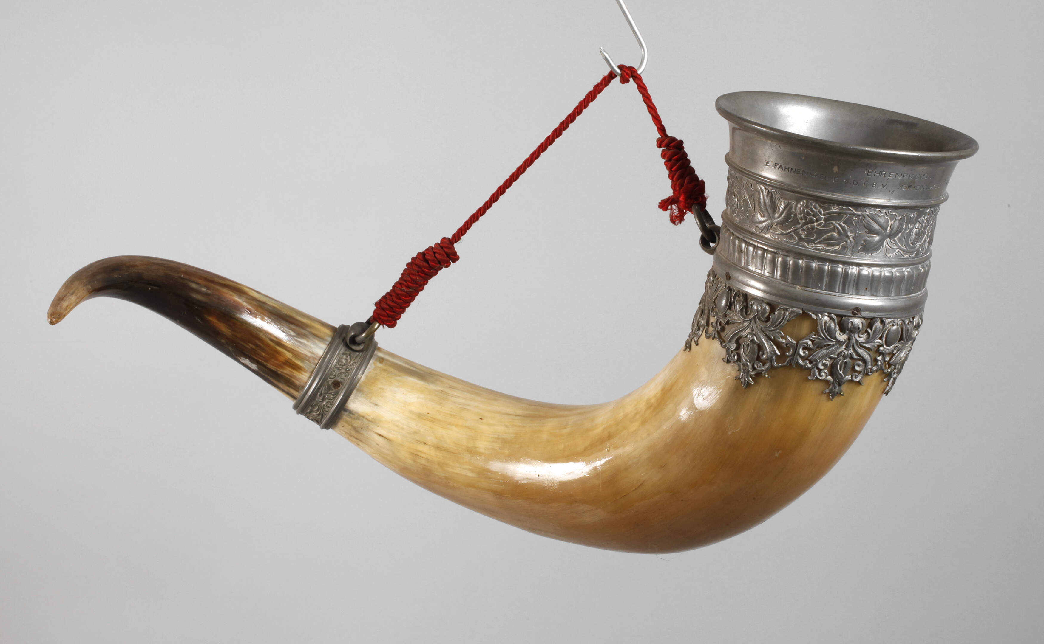 1920er Jahre, bezeichnet Ehrenpreis z. Fahnenweihe o. G. T. E. v. "Neu-Edelweiss" Schwaben, großes geschwungenes Horn mit floraler und ornamentaler Zinnmontierung sowie Kordelband, Altersspuren, L 48 cm.