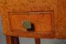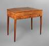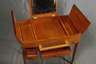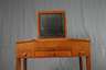Frankreich, 1930er Jahre, in Tujawurzel und Zitronenholz furniert, frei im Raum stellbarer Verwandlungstisch mit klappbarem Spiegel, unter den scharnierten Seitendeckeln jeweils eine Ablage, Front mit drei Schubkästen und ausziehbarer Schreibplatte mit Lederbespannung, originale Messingbeschläge, Maße 83 x 90 x 55 cm.