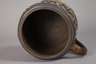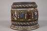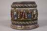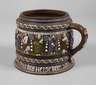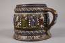 wohl um 1880, sogenannter Bienenkorb-Humpen, datiert 1696, dunkelbrauner Steinzeugscherben mit Salzglasur, bemalt in bunten Schmelzfarben, schauseitig Jesus mit Heiligenschein, seitlich begrenzt von seinen Aposteln, verschlungene Ornamentbänder, ein GUrtband aus Blech und Zinn, Spruchband: "Drinck Mich Aus Und Schenk Mich Ein Das Du Erfrischt Das Herze Dein 1696", am Lippenrand zwei Chips, ohne Deckel, H 13,5 cm. Quelle: Silvia Glaser, Malerei und Feuerkunst, Sammlung Neuner, Band 3, S. 126, Nr. 56, dort andere Bemalung.