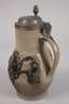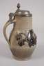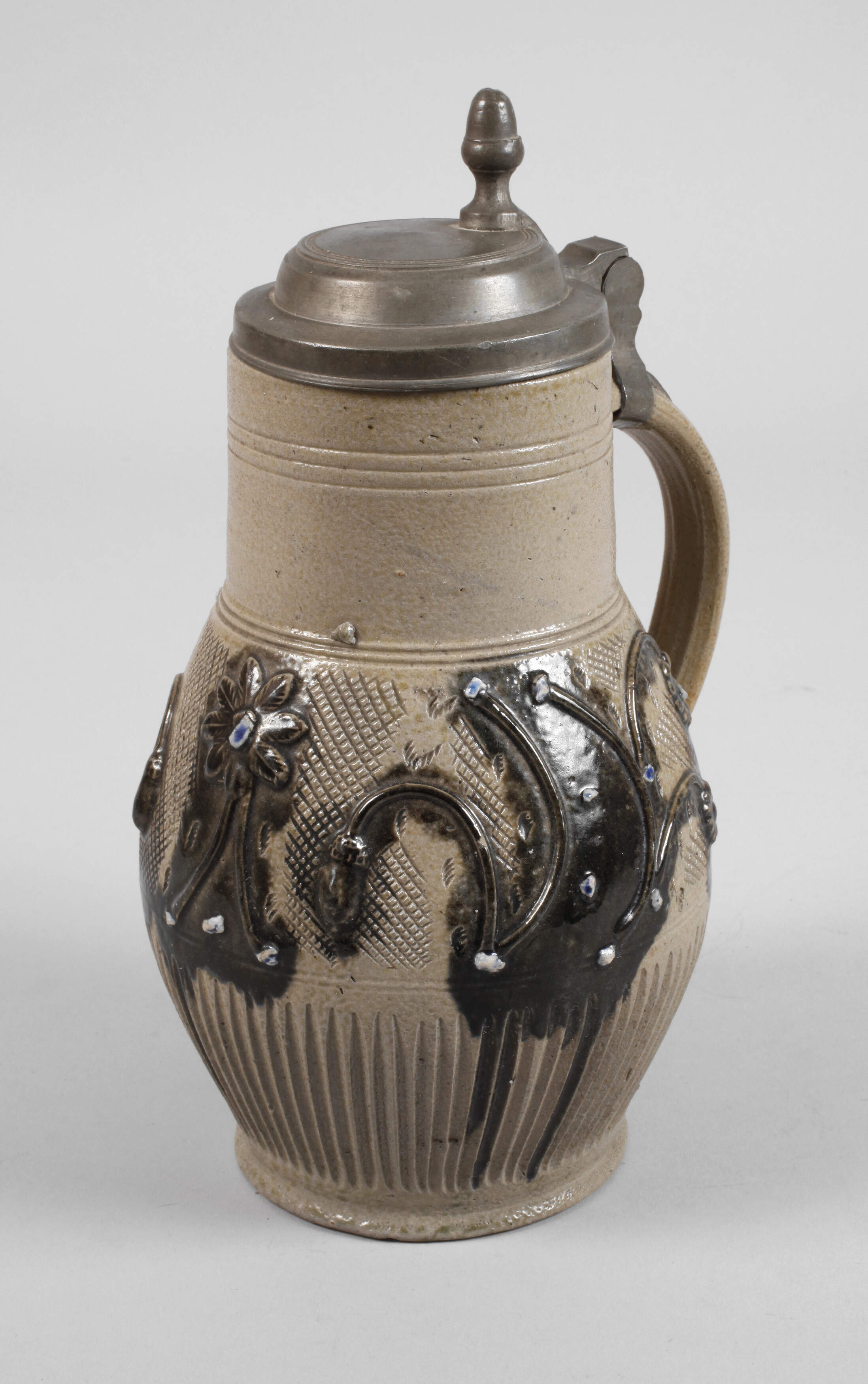 um 1840/50, graues Steinzeug salzglasiert und geritzt, aufgemodelte Blüten und Eicheln, aufgesetzte Steinchen mit kobaltblauer Bemalung (eins fehlt), übergreifender Zinndeckel mit Eichel als Drücker, normale Altersspuren, H 24,5 cm.