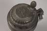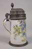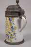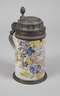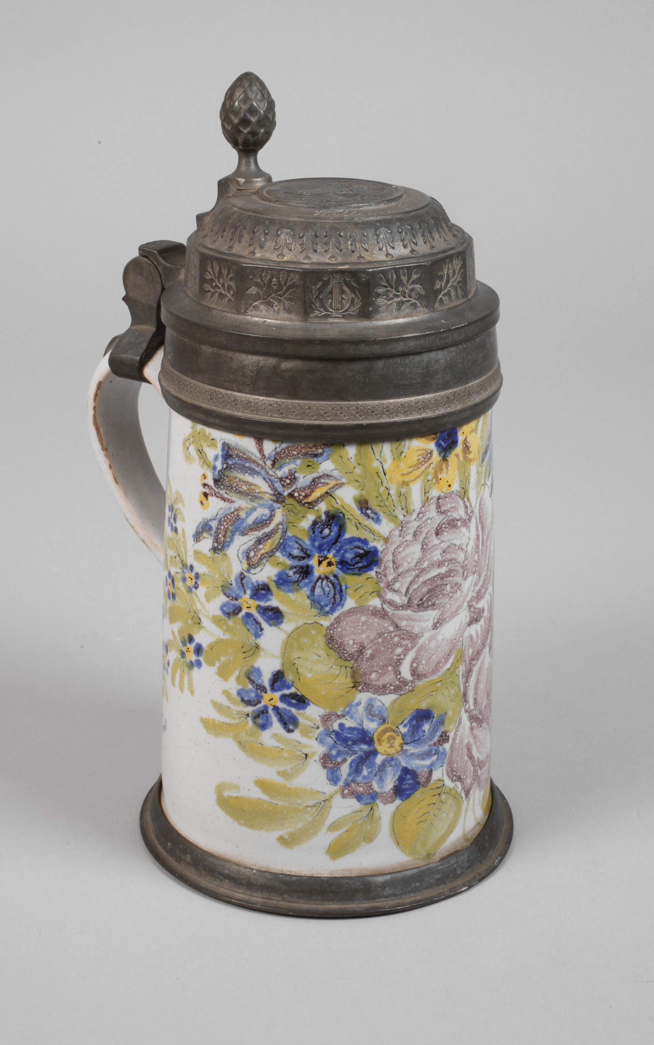 datiert 16.XI.(18)35, Besitzername "Willem u. Lisl Keller", rötlicher Fayencescherben mit geritztem Zeichen, weißlich glasiert und mit Scharffeuerfarben bemalt, schwarz konturiertes Blumenbukett, Zinnmontierung bestehend aus Standring, Lippenrand und übergreifendem Deckel mit floralen Reliefs, Eicheldrücker, mittig Plakette mit Adler und Füllhörnern, im Blattkranz unter einem Stern, innen ein nicht durchgehender kurzer Glasurriss, Standring etwas gedellt, H 24 cm.
