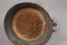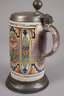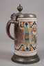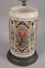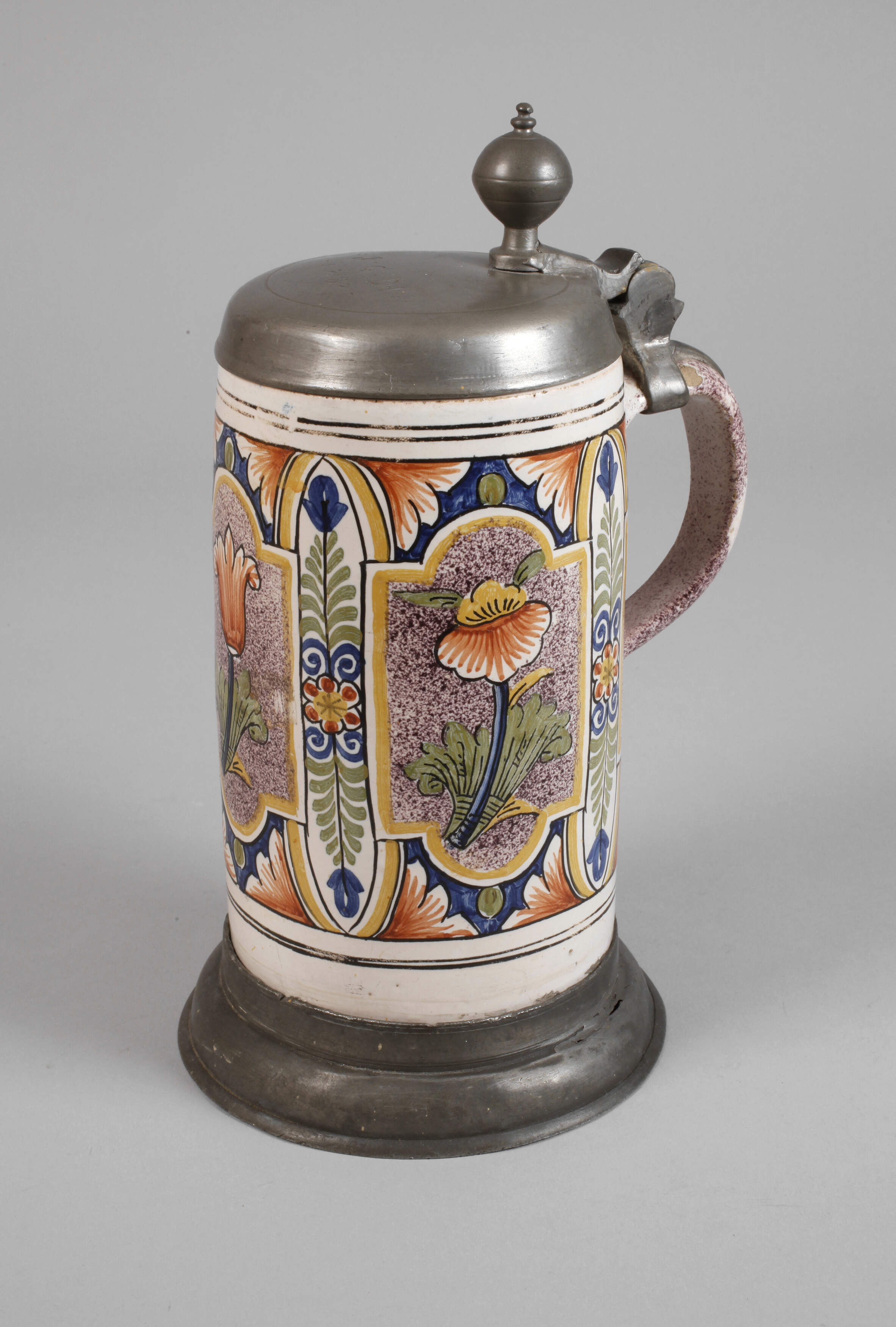 datiert 1787, heller Fayencescherben mit bunten Scharffeuerfarben floral bemalt, partiell mangangeschwämmelt, Pilasterdekor, Zinnmontierung bestehend aus glockenförmigem Zinnstandring und übergreifendem Deckel mit Kugel, Besitzermonogramm "J. G. Dh.", Montierung alt repariert, H 25 cm.