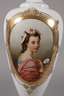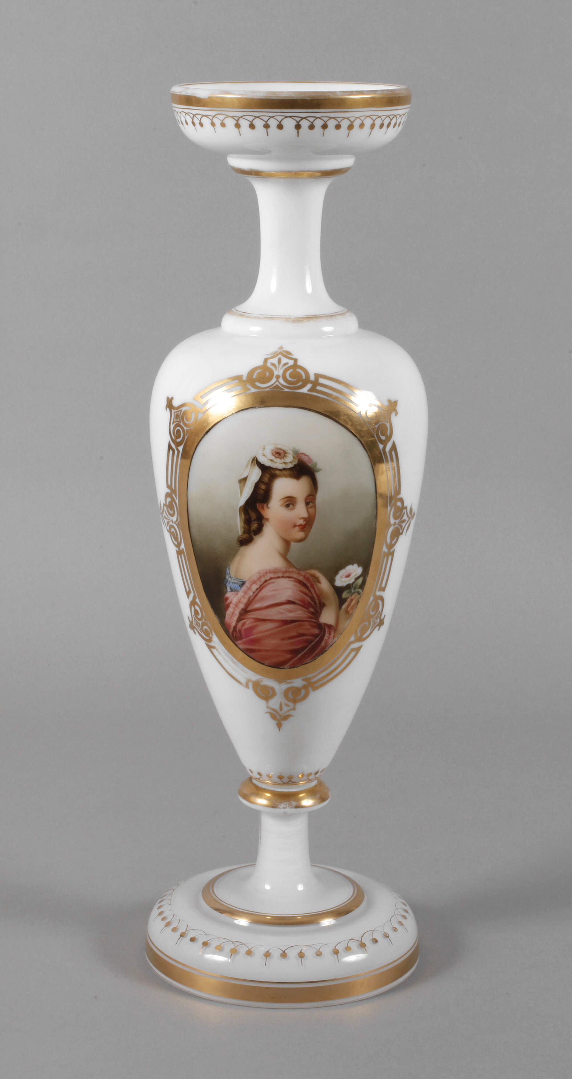 um 1860, der Fuß aus farblosem Glas, weiß unterfangen, die angesetzte Vase aus Milchglas, schauseitig ein großes Medaillon mit einem ausgemalten Mädchenportrait, in ornamentaler Goldkartusche, umlaufende Bandmotive, etwas berieben und Fuß kaum sichtbar geklebt, H 54 cm.