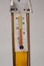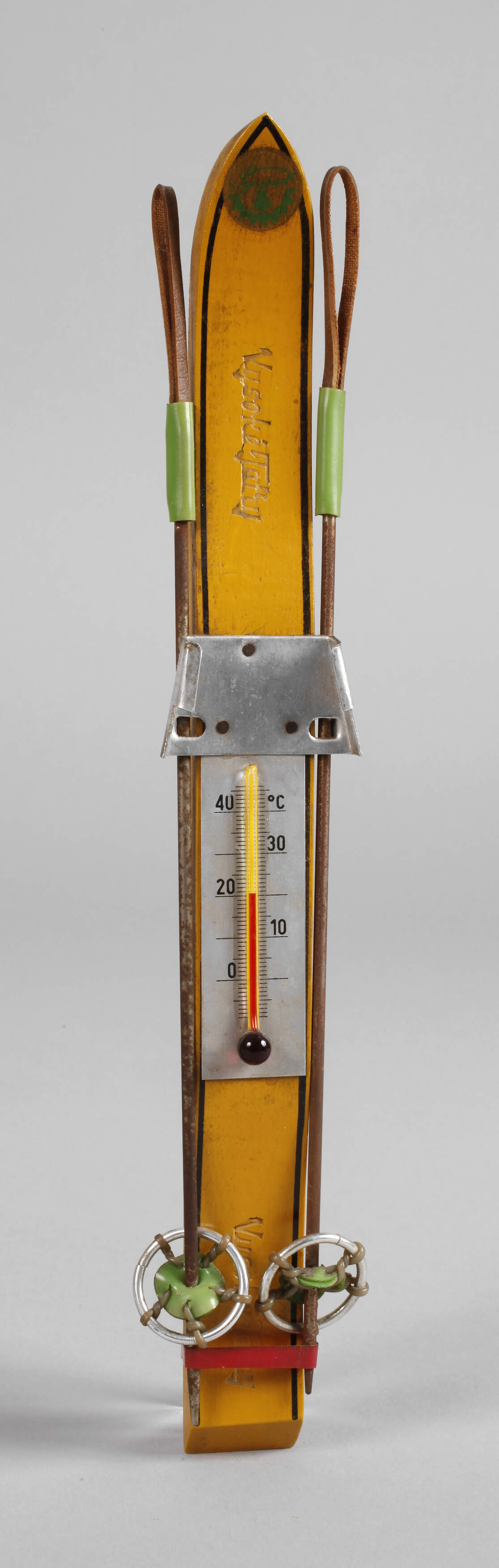 um 1930, bezeichnet Vysoke Tatry, Holz geschnitzt, farbig gefasst, metallmontiert, in Form eines Skis gestaltetes Thermometer mit Angabe in Celsius, Altersspuren, funktionstüchtig, L 22 cm.