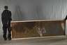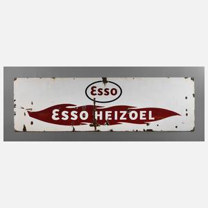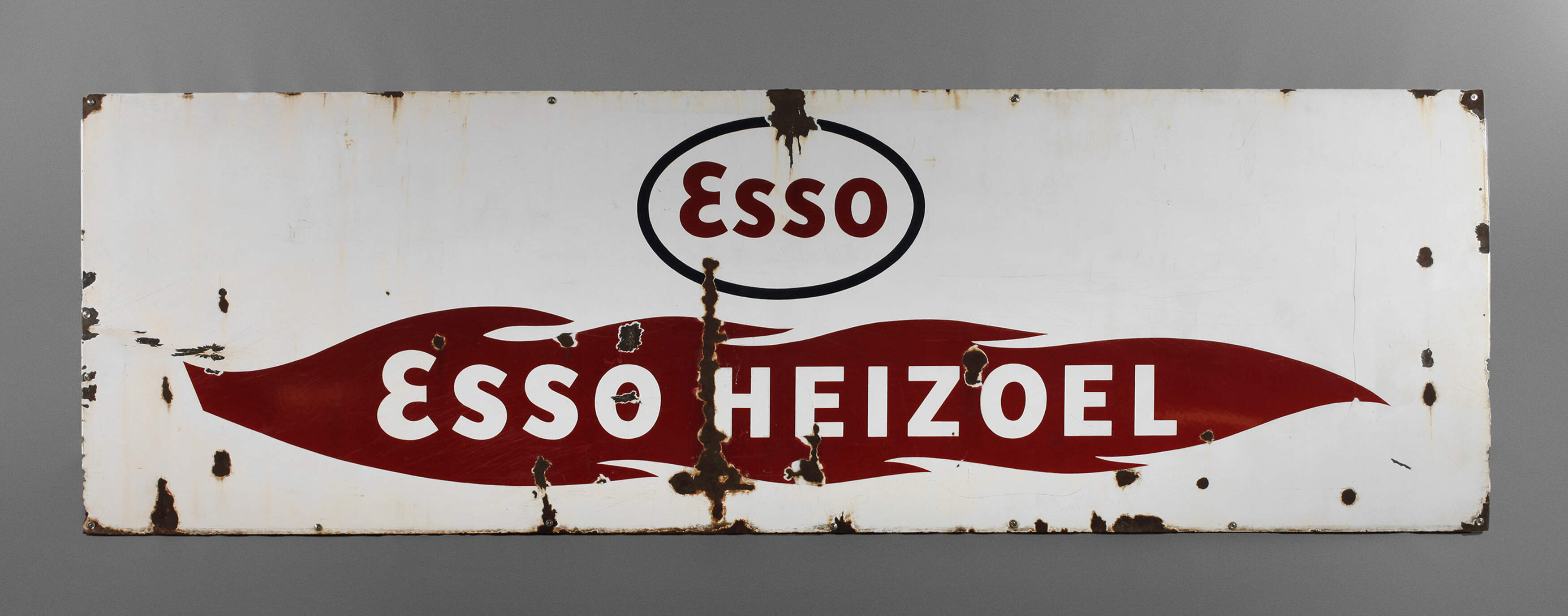 1950er Jahre, ohne Hersteller, planes langrechteckiges Schild, dreifarbig emailliert, für Esso Heizöl, auf Holzrahmen montiert, mit mehreren, teils nachträglichen Bohrungen, Substanzverluste, Korrosionsspuren, Z 2–3, Maße 100 x 300 cm.