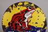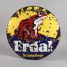um 1920, ohne Hersteller, kreisrundes gebauchtes Schild, fünffarbig emailliert, mit Umschrift und Werbeemblem, vier originale Bohrungen, größere Emailleverluste und Korrosionsspuren, Z 3, D 70 cm.