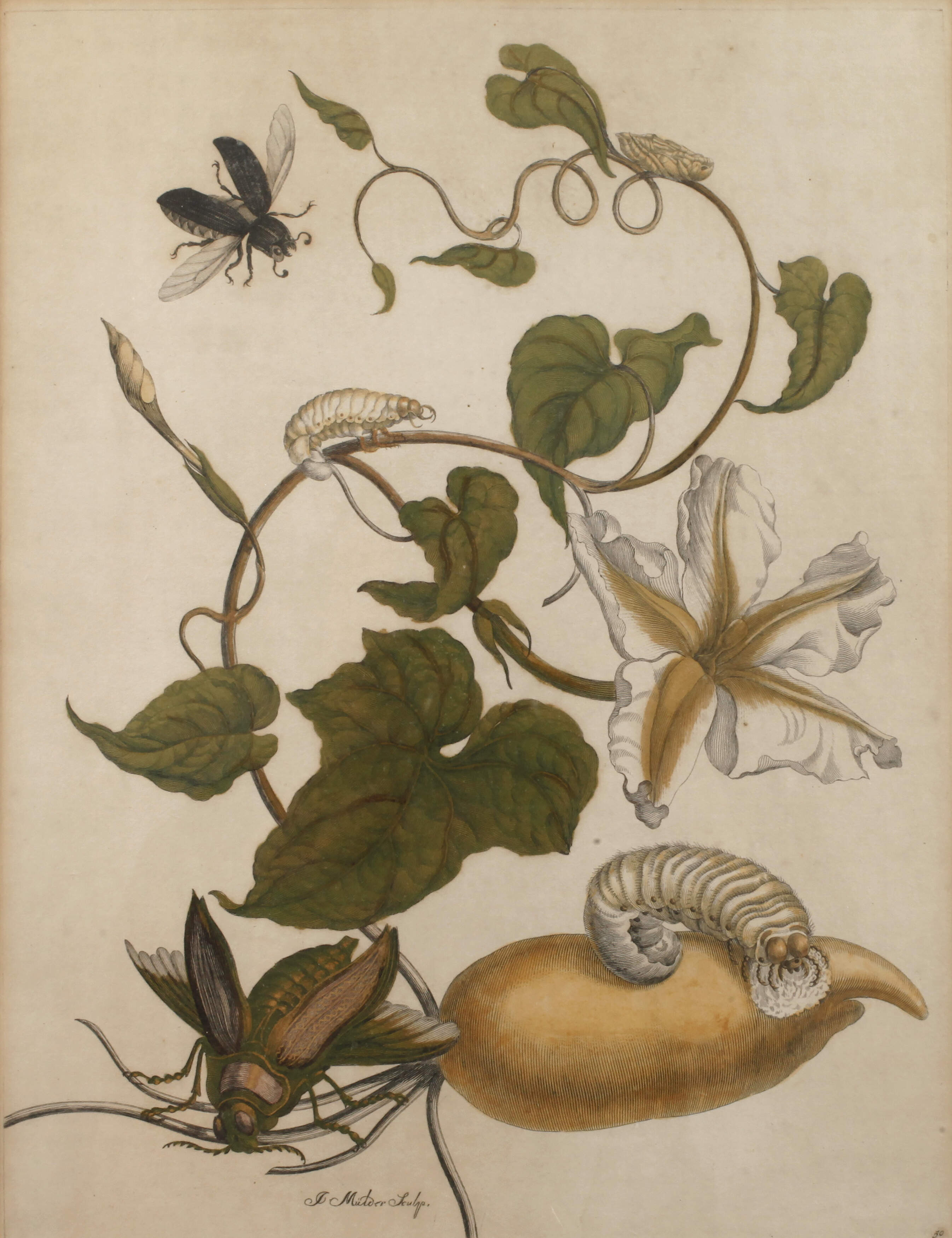 blühende Winde mit Blättern und Früchten, bevölkert von allerlei Getier, nach Maria Sybilla Merian, Blatt 50 aus "Metamorphosis Insectorum Surinamensium" (Die Verwandlung der surinamesischen Insekten), erschienen bei Gerard Valk, erstmals erschienen 1705 in Amsterdam, kolorierter Kupferstich, im unteren Bereich in der Platte signiert "J. Muder Sculp.", rechts unten Zahl "50", auf Rahmenrückwand Etikett und hier handschriftlich bezeichnet "Altkolorierter Kupferstich von Maria Sybilla Merian Gestochen von Mulder. Um 1730", im Passepartout, gebräunt, unter Passepartout und hinter Glas gerahmt, Plattenmaße ca. 33,7 x 26 cm. Künstlerinfo: dt. Malerin und Enthomologin (1647 Frankfurt/Main bis 1717 Amsterdam), jüngstes Kind von Matthäus Merian dem Älteren, lernte schon im Kindesalter die verschiedenen Drucktechniken im Betrieb des Vaters kennen, ihr Stiefvater Jacob Marell weckte bei ihr das Interesse an der Blumenmalerei, 1675/80 veröffentlichte sie ihr dreibändiges „Neues Blumenbuch“, 1679 erschien ebenfalls in Nürnberg “Der Raupen wunderbare Verwandlung“, seit 1691 in Amsterdam ansässig, ab 1699 zweijährige Forschungsreise nach Surinam, als Ergebnis ihrer Forschung erschien „ Metamorphosis Insectorum Surinamensium“, eines der bedeutendsten Werke der frühen Naturwissenschaft, Quelle: Thieme-Becker, Wikipedia und Internet.