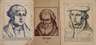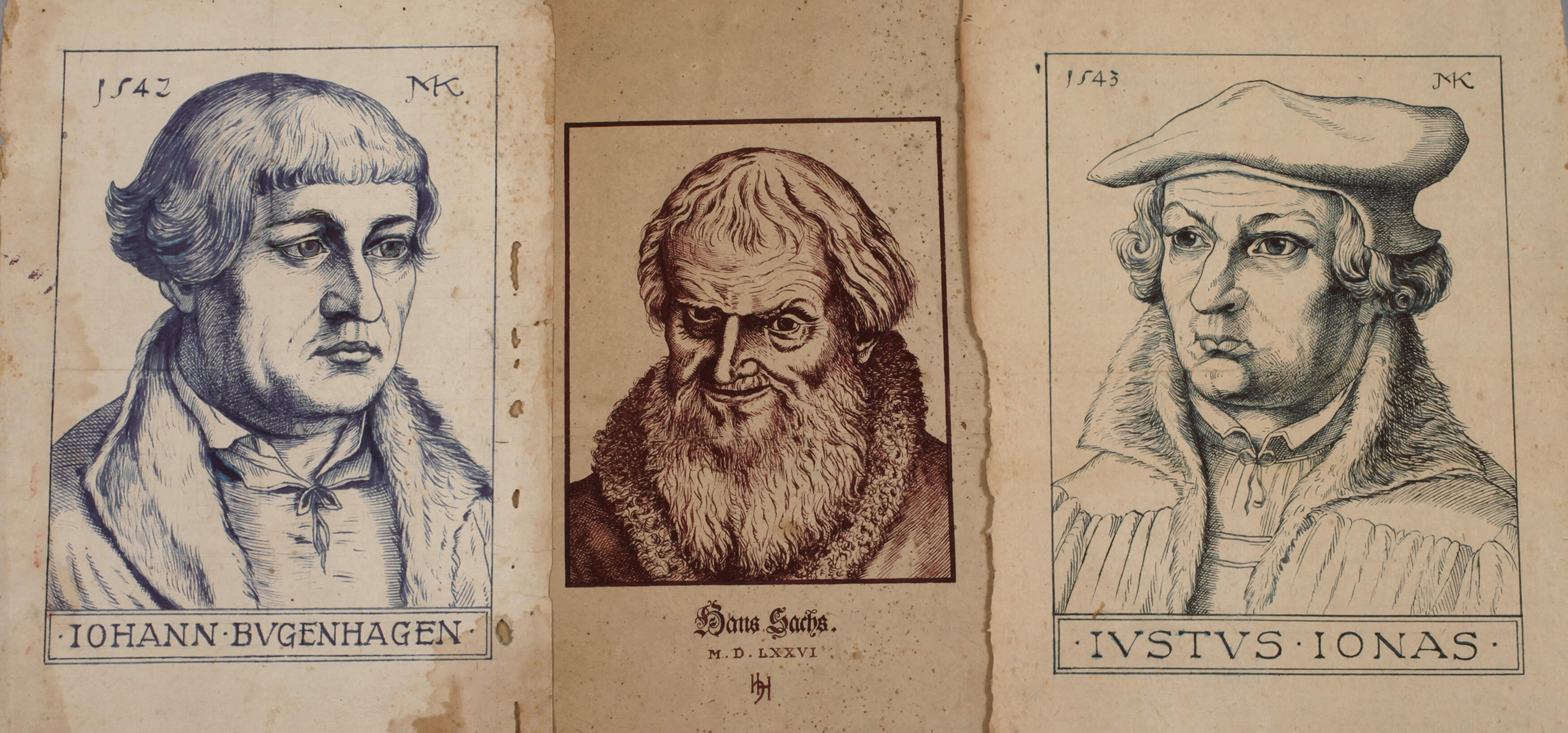 dabei Kopfbildnis des Reformators und engen Freundes Martin Luthers, Justus Jonas des Älteren (1493 Nordhausen bis 1555 Eichsfeld) nach älterem Vorbild von 1543, weiterhin Kopfbildnis des Reformators und Weggefährten Martin Luthers, Johannes Bugenhagen (1485 Wollin bis 1558 Wittenberg) nach älterem Vorbild von 1542, beide Blätter je in der Darstellung ligiert monogrammiert "MK", laut ungeprüfter alter Beschriftung bezieht sich das Monogramm auf Matz Krodel aus Schneeberg, weiterhin Bildnis des Schuhmachers, Dichters und Meistersingers Hans Sachs (1494 Nürnberg bis 1576 Nürnberg) im 81. Lebensjahr nach einem Kupferstich von Jost Amman, unter der Darstellung bezeichnet, römisch datiert und ligiert monogrammiert "Hans Sachs – M.D.LXXVI [1574] HH", je Tusche auf altem Bütten, wohl 19. Jh., Erhaltungsmängel, ungerahmt, Blattmaße je ca. 38 x 24 cm.