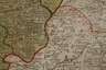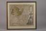 rechts unten prachtvolle Kartusche mit verschiedenen Szenen und hierin bezeichnet "S. R. I. Comitatus Henneberg ...", darüber von Engeln getragenes Doppelwappen sowie mit Rocaillen umranktes Feld mit Legende, oberhalb der Darstellung Schrift "Karte der Gefürsteten Graffschaft Henneberg, mit dem angrenzenden Fürstenth. Coburg u. anderen Graenzlaendern ... Herausgegeben von Homannischen Erben in Nürnberg" und hier datiert "1743", unterhalb der Darstellung weitere Schrift, Darstellung des Gebiets zwischen Georgental im Norden, Lichtenfels im Osten, Schweinfurt im Süden und Heiligenkreuz im Westen, teilkolorierter Kupferstich, etwas gebräunt, mittig Faltlinie, unter Passepartout und hinter Glas gerahmt, Darstellungsmaße ohne Schrift ca. 47,5 x 56,5 cm. Info Homanns Erben: Johann Baptist Homann (1664 Kambach bis 1724 Nürnberg, dt. Kupferstecher, Verleger und Jesuit) gründete um 1702 den eigenen Verlag "Homännisches Landkarten-Offizin", tätig unter anderem in Wien, Leipzig und Nürnberg, nach seinem Tod am 1. Juli 1724 ging sein Unternehmen auf seinen Sohn Dr. Johann Christoph Homann (1703−1730) über, der seine beiden Geschäftsführer Johann Georg Ebersberger (oder Ebersperger) und Johann Michael Franz zu Erben der Handlung einsetzte, nach seinem Tod 1730 wurde das Unternehmen unter dem Namen „Homannsche Erben“ (frz. Heritiers de Homann, lateinisch Homannianos Heredes) fortgeführt und erlosch erst 1848 mit dem Tod des letzten Besitzers Christoph Franz Fembo, Quelle: Thieme-Becker und Internet.