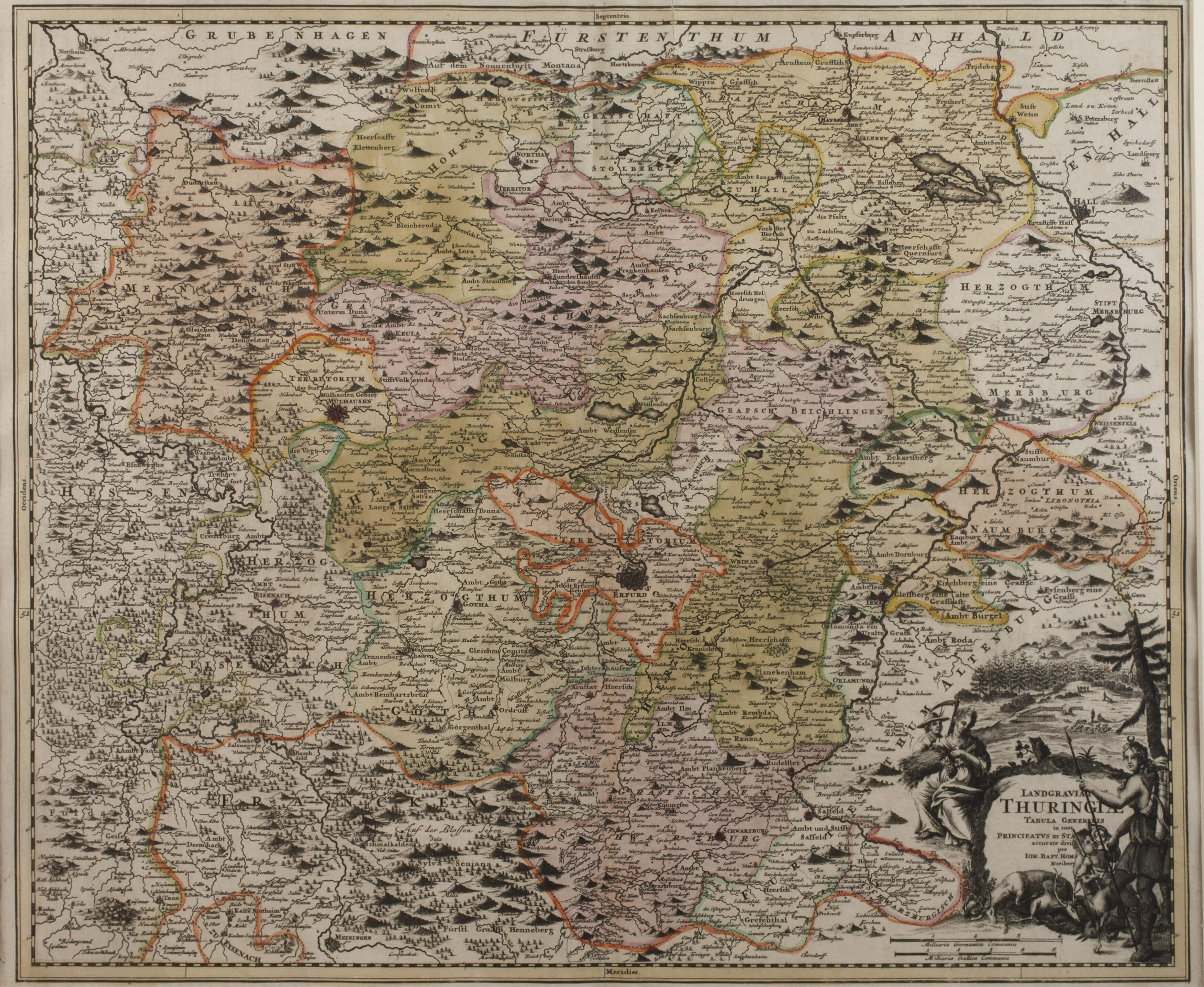 rechts unten figürliche Kartusche und hierin bezeichnet "Landgraviae Thuringiae Tabula generalis ... per Joh. Bapt. Homa ...(teils von Figuren verdeckt)", Darstellung des Gebiets zwischen Straßburg im Norden, Gera im Osten, Meiningen im Süden und Göttingen im Westen, etwa mittig liegt Erfurt, teilkolorierter Kupferstich, um 1720, schöner kräftiger Druck, mittig saubere Faltlinie, unter Passepartout und hinter Glas gerahmt, Darstellungsmaße ca. 47,5 x 57 cm. Künstlerinfo: dt. Kupferstecher, Verleger und Jesuit (1664 Kambach bis 1724 Nürnberg), vermutlich Schüler von David Funck, gründete um 1702 den eigenen Verlag "Homännisches Landkarten-Offizin", 1715 Mitglied der königlich-preußischen Societät der Wissenschaften, Kaiser Karl VI. verlieh ihm den Titel eines "Kayserlichen Geographen" und der russische Zar Peter der Große ernannte Homann zum "Kayserlich russischen Agenten", tätig unter anderem in Wien, Leipzig und Nürnberg, Quelle: Thieme-Becker und Internet.