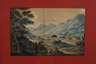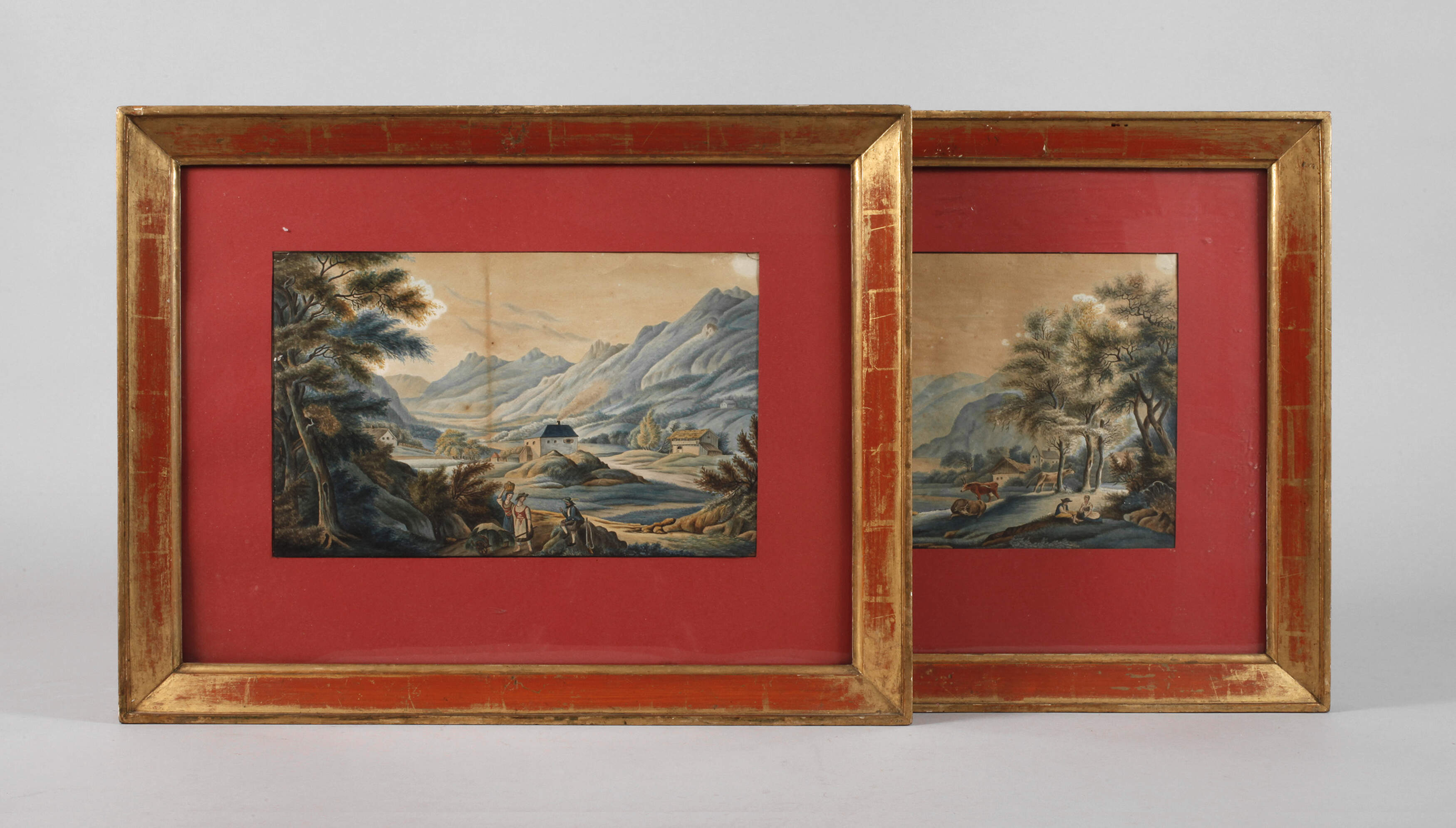 von einer Bergkette gesäumtes weites Tal mit vereinzelten Häusern und Figurenstaffage im Vordergrund sowie Klosteranlage vor Bergkulisse mit Kühen und Figuren im Vordergrund, Deckfarben auf Papier, Mitte 19. Jh., gebräunt und leichte Eckverluste, unter Passepartout und hinter Glas als Pendants in Vergolderrahmen, Passepartoutausschnitt je ca. 21 x 32,5 cm.