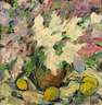 blühender weißer Fliederstrauß im irdenen Henkeltopf und vier Zitronen, kraftvolle, lebhafte Stilllebenmalerei mit pastosem Farbauftrag, Öl auf Sperrholztafel, rechts unten monogrammiert und datiert "FB (19)73", auf Tafelrückseite betitelt und bezeichnet "– Flieder u. Citronen – Original-Ölmalerei 1973 Format 71,5 x 70,5 (kein Schlußfirnis) Fredo Bley Buchwald/Vogtland", Rahmen rückseitig bezeichnet "Fredo Bley Bez. K.-M.-St. 9801 Buchwald/Vogtland VBKD. DDR", leichte Rissbildung, in einfachem Holzrahmen, Falzmaße ca. 71,5 x 70,5 cm. Künstlerinfo: eigentlich Fredo Robert Bley, dt. Maler und Graphiker (1929 Mylau im Vogtland bis 2010 Reichenbach), 1943–46 zusammen mit Wolfgang Mattheuer Lithographenausbildung bei Carl Werner in Reichenbach, um der Dienstverpflichtung zum Uranbergbau der Wismut zu entgehen, 1946–48 als Land- und Forstarbeiter in Thüringen tätig, 1948–56 Lehre und Tätigkeit als Dekorations- und Schriftenmaler, Anregung durch den Maler Walter Löhner, weitestgehend Autodidakt, seit 1952 Mitglied des Verbandes Bildender Künstler (VBK) der DDR, aus materiellen Zwängen 1957–64 parallel als Ziegelei- und Baufacharbeiter tätig, ab 1966 freischaffend, parallel zeitweise Werksvertrag mit dem VEB Baumechanik Lengenfeld und bis 1990 Zirkelleiter für Malerei in der "NEMA" Netzschkau, beschickte zahlreiche Ausstellungen, unter anderem 2002 im neuen Bundeskanzleramt Berlin, tätig in Mylau, ab 1960 im selbst errichteten Eigenheim in Buchwald, Quelle: AKL, Eisold “Künstler in der DDR”, Frank Weiß "Malerei im Vogtland" und Wikipedia.