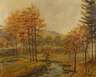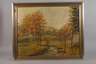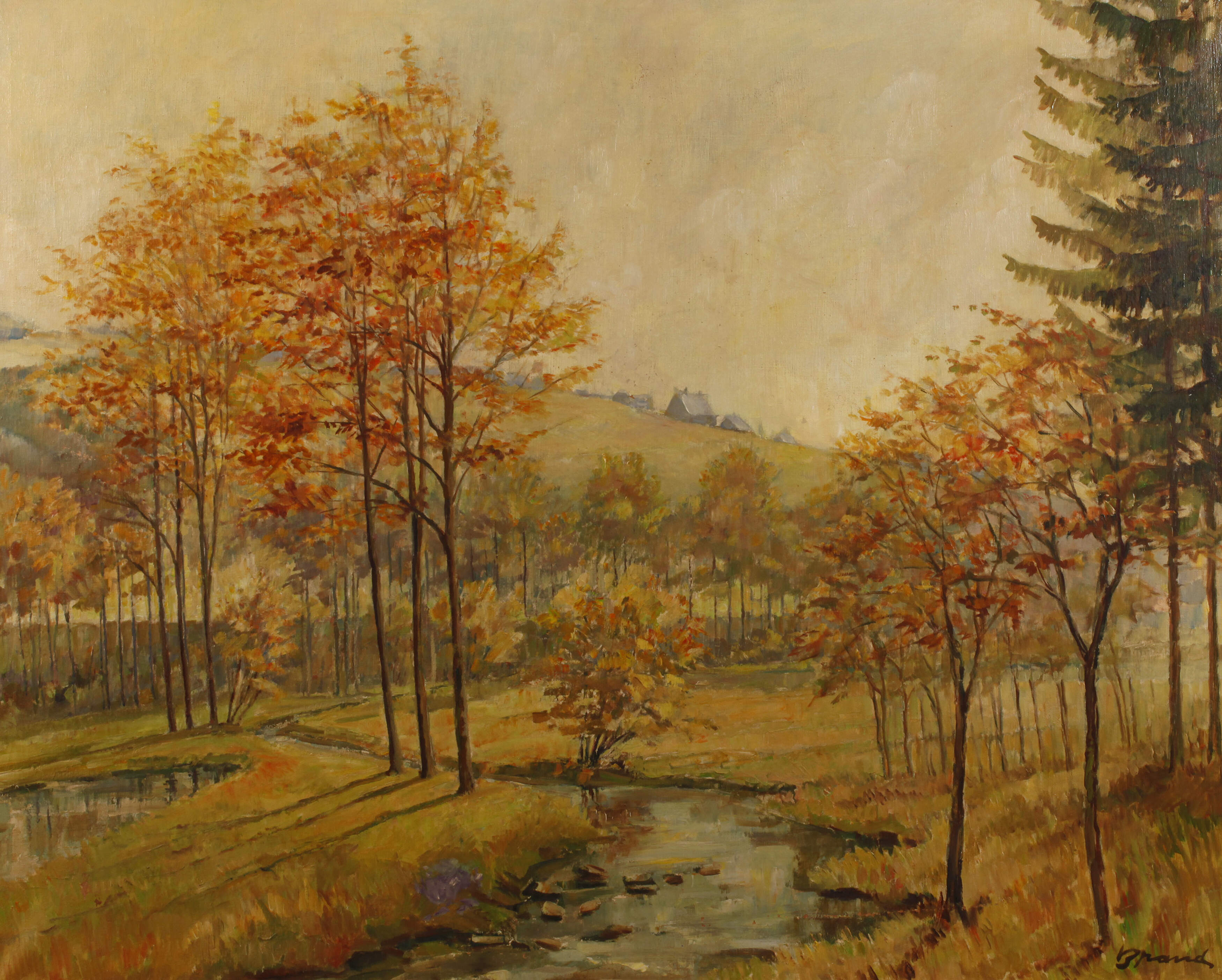 spätsommerlicher Talgrund mit bunt verfärbten Bäumen entlang des Ufers des auch "Treuener Wasser" genannten Nebenflusses der Trieb im sächsischen Vogtland, gering pastose, impressionistische Landschaftsmalerei, Öl auf Leinwand, um 1940, rechts unten signiert "Brand", Retusche, Keilrahmen holzwurmstichig, etwas restaurierungsbedürftig, in Silberleiste gerahmt, Falzmaße ca. 80 x 100 cm. Künstlerinfo: auch Walter Brand, dt. Landschafts- und Blumenmaler, Graphiker und Reklamekünstler (1894 Leipzig bis nach 1958 Auerbach?), studierte an der Akademie Leipzig bei Fritz Ernst Rentsch und Paul Horst-Schulze, als Kunsterzieher (Oberlehrer) an der „Deutschen Oberschule“ in Auerbach im Vogtland tätig, Quelle: Vollmer.