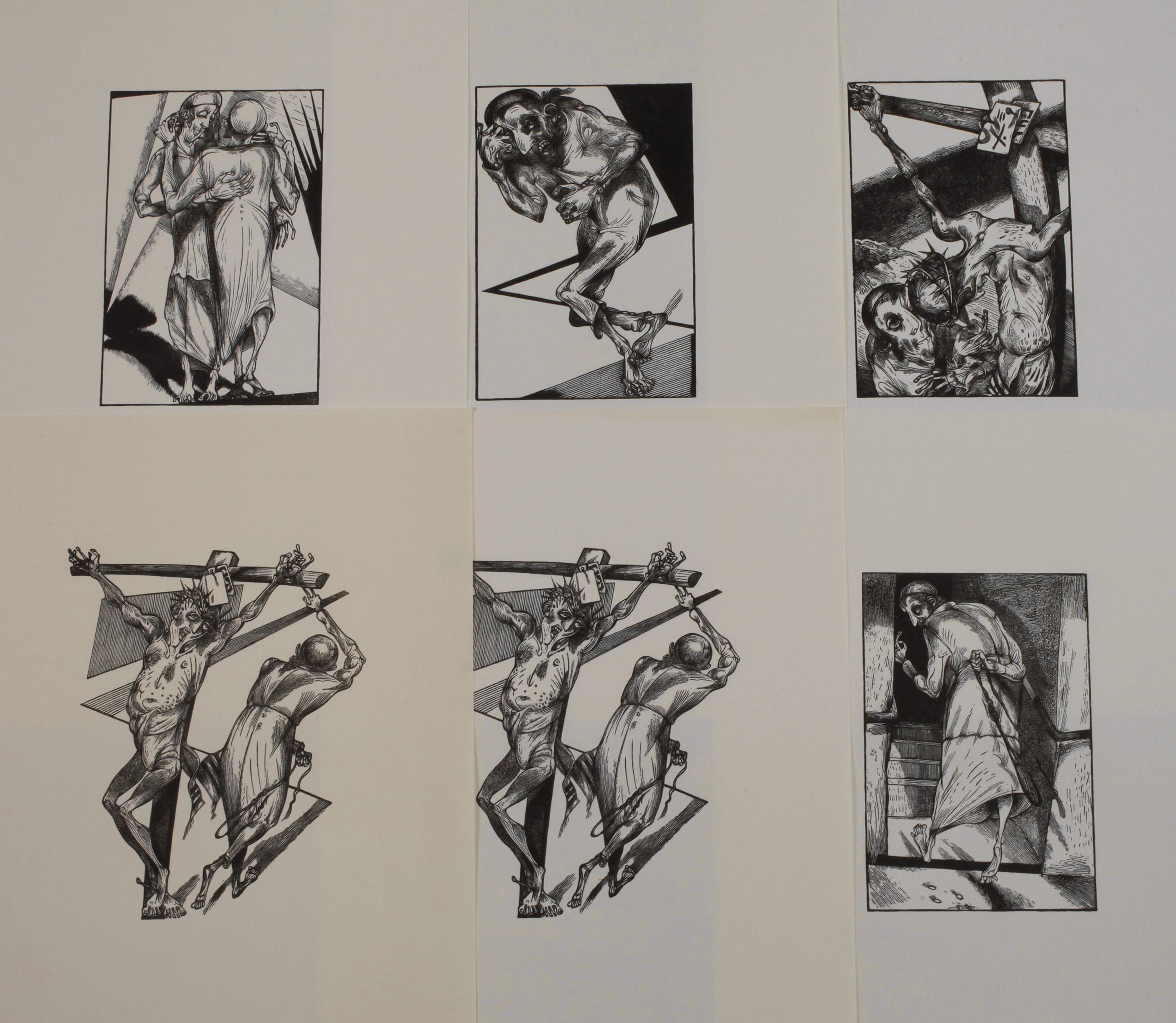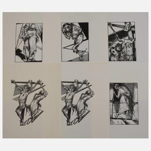 wohl entstanden für das Buch von Walter Jens "Ich, ein Jud -Verteidigungsrede des Judas Ischarioth" erschienen bei der Burgart-Presse in Rudolstadt im Jahr 2004, sechs Holzstiche, davon ein Motiv doppelt, unsigniert, Darstellungsmaße max. ca. 13,5 x 11,5 cm, Blattmaße ca. 30 x 19 cm. Künstlerinfo: dt. Graphiker, Zeichner und Illustrator (geboren 1938 in Breslau), 1945 Flucht von Breslau nach Leipzig, 1952-60 Lehre und Tätigkeit als Stuckateur, parallel Schüler der Abendschule der HGB bei Walter Münze, studierte 1960-65 an der HGB Leipzig bei Gerhard Kurt Müller, 1965-67 freischaffend, Mitglied im VBK der DDR, 1967-70 Aspirantur an der HGB, ab 1976 Dozent an der HGB, 1981-82 Gastdozent für Holzstich an der Universität Jyväskylä/Finnland, 1989-2003 Professor an die HGB Leipzig, 1990-97 Prorektor der HGB, ab 1990 Mitglied des Bundes Deutscher Buchkünstler, beschickte die Kunstausstellungen der DDR und zahlreiche nationale und internationale Ausstellungen, erhielt diverse Ehrungen, u. a. Nationalpreis der DDR, mehrmals Preis für "Schönste Bücher", Preise der Internationalen Buchkunst-Ausstellung Leipzig und 2011 den Gutenberg-Preis der Stadt Leipzig, tätig in Leipzig und Dölitzsch-Narsdorf bei Geithain, Quelle: Eisold "Künstler in der DDR" und Internet.