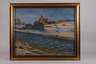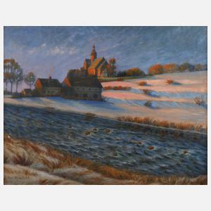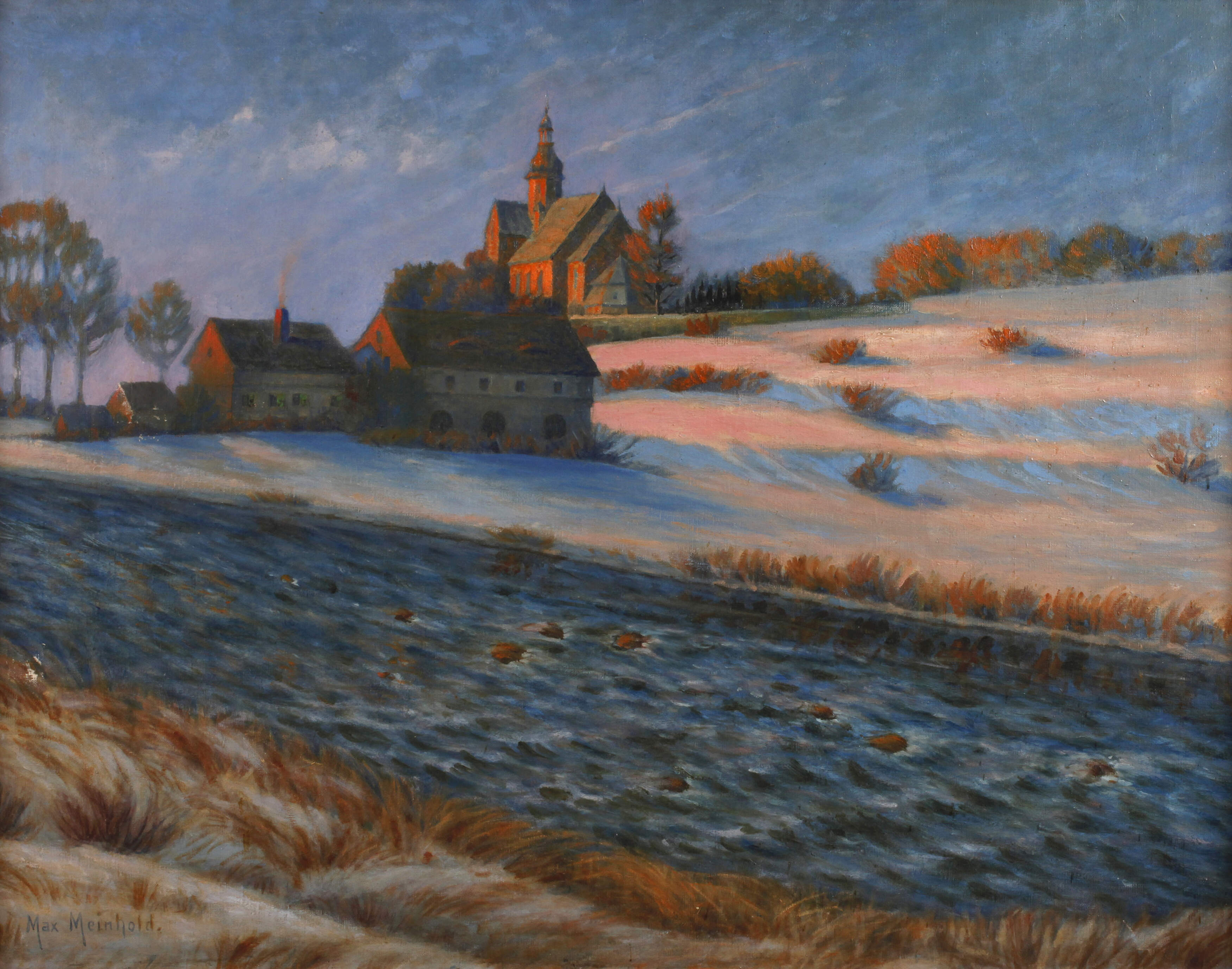 stimmungsvolle vogtländische Winterlandschaft mit Blick über die Weiße Elster und verschneite Wiesen, zum ehemaligen Rittergut unterhalb der auf einem Felssporn thronenden Dorfkirche, im warmen Licht des Sonnenuntergangs, gering pastose Landschaftsmalerei in fein abgestimmter Farbigkeit, Öl auf Leinwand, 1. Hälfte 20. Jh., links unten signiert "Max Meinhold", hinterlegte Fehlstelle in der Leinwand, alt restauriert, etwas restaurierungsbedürftig, schön gerahmt, Falzmaße ca. 70,5 x 90,5 cm.