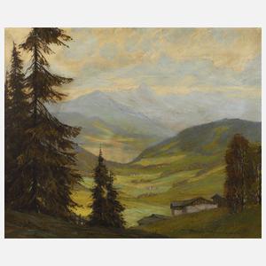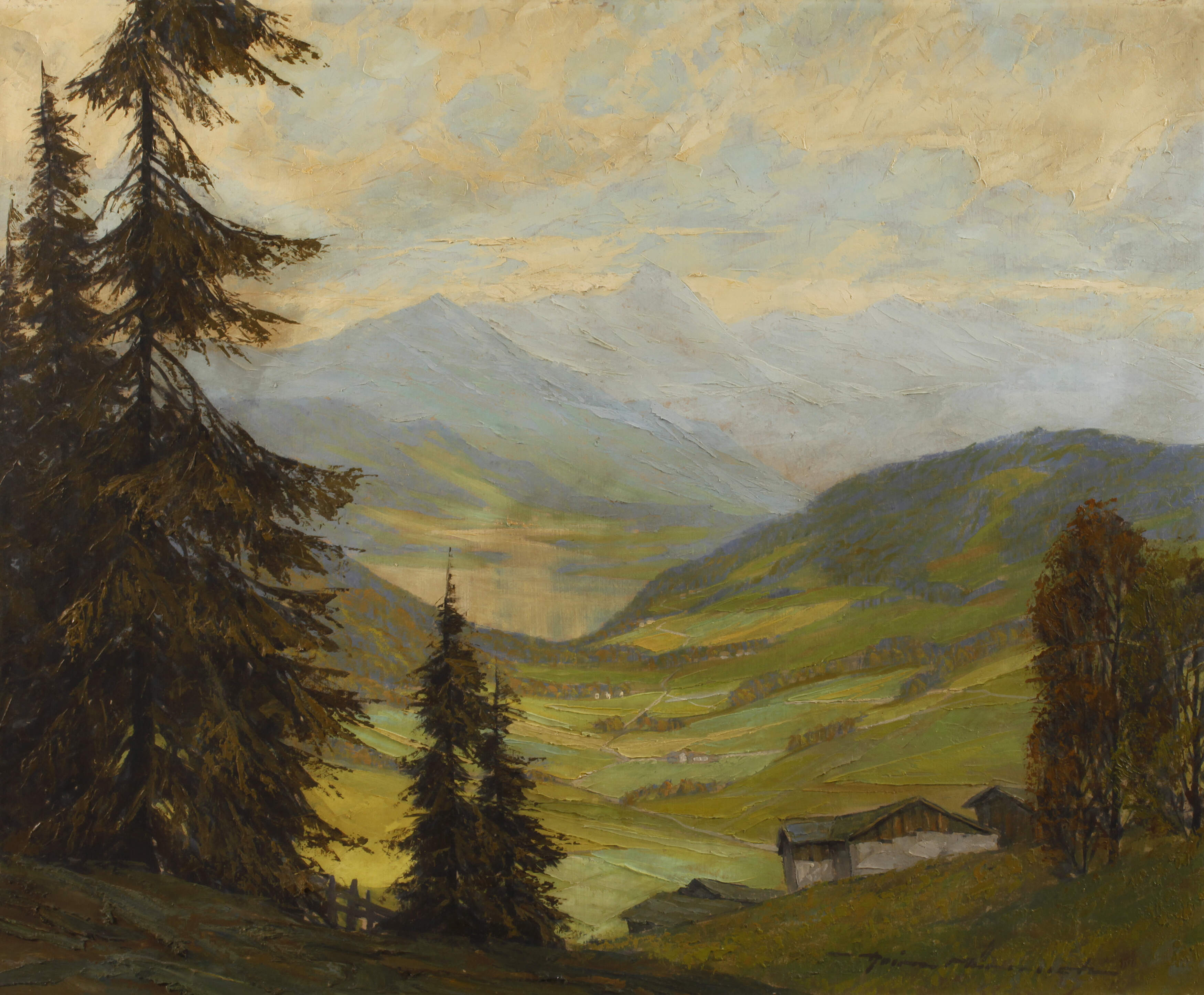 Blick vom erhöhten Standpunkt, vorbei an Nadel- und Laubbäumen in weites Gebirgstal mit Bauernhäusern, vor imposanter Hochgebirgskulisse, pastose Landschaftsmalerei mit breitem Pinselduktus, partiell gespachtelt, Öl auf Karton, um 1970, rechts unten signiert "Heinz Münnich", reinigungsbedürftig, ungerahmt, Maße ca. 59 x 72 cm. Künstlerinfo: auch Münnich Junior, dt. Maler und Graphiker (1921 Chemnitz bis 1977 Starnberg), Sohn des Chemnitzer Kunstmalers Hans Münnich (1892 Chemnitz bis 1970 Chemnitz), erste Ausbildung beim Vater, weitergebildet in Dresden und in Luxemburg, unternahm Studienreisen nach Frankreich, Italien, der Schweiz, Griechenland, Österreich, Sizilien, Kanada und den USA, ab 1944 freischaffend, beschickte die Ausstellungen des „Hauses der Kunst“ in München, ab 1944 tätig in Chemnitz (Karl-Marx-Stadt), später in Ingolstadt an der Donau, Quelle: Internet.