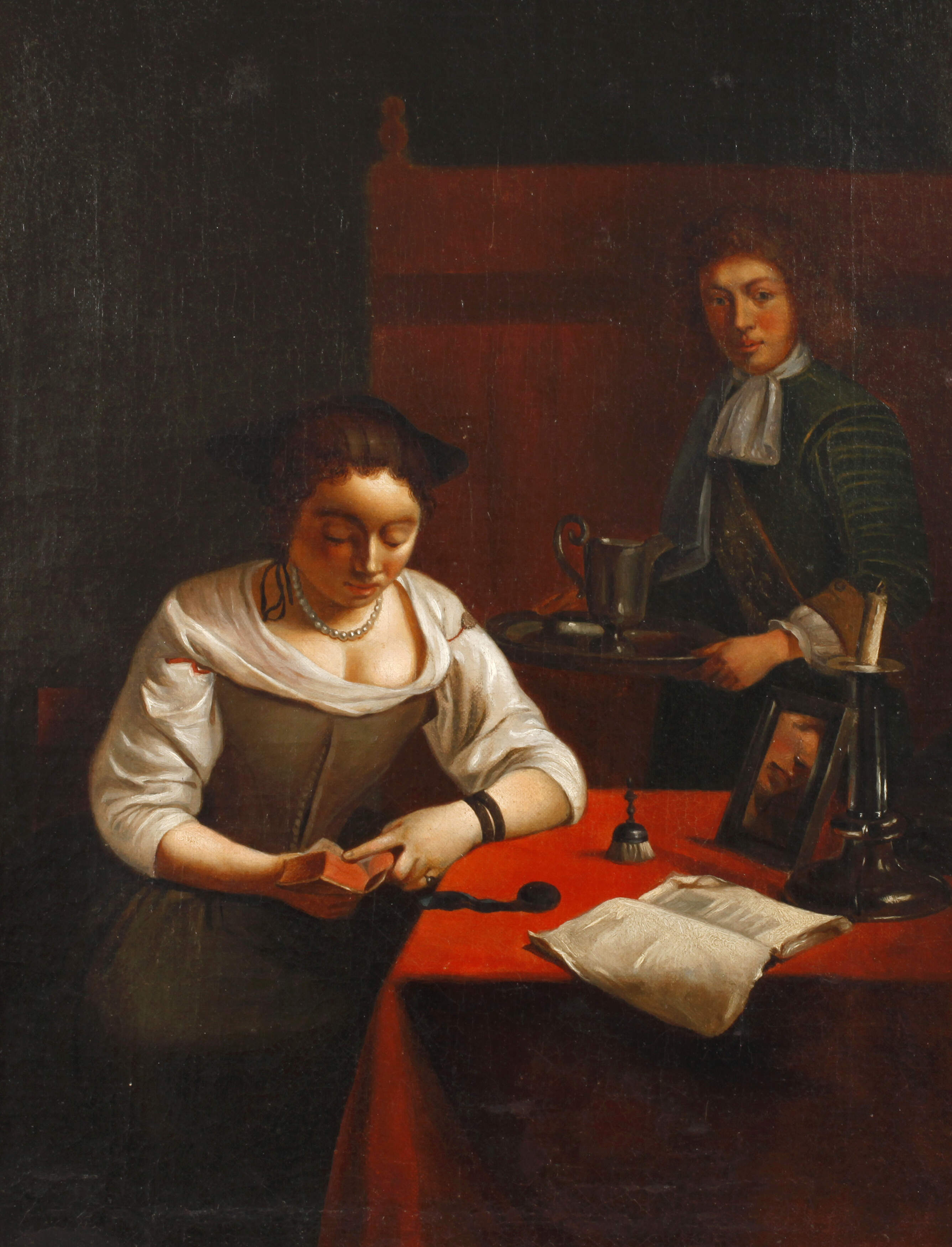 junge Frau am Tisch, in die Lektüre eines Stundenbuchs vertieft, im Hintergrund bringt ein herrschaftlich gekleideter Jüngling einen Wasserkrug nebst Lavabo, stimmungsvolle, fein lasierende Genremalerei mit effektvollem Licht in der Tradition des Gabriel Metsu (1629–1667), wohl 18. Jahrhundert, unsigniert, rückseitig Vorbesitzerinfo zum Gemälde "Dieses Bild erhielt mein Großvater Julius Ludwig Kruse 7.3.1871 – 30.5.1938 in St. Petersburg vor 1914 anstelle einer Zahlung für eine Warenlieferung ...", Craquelure, randdoubliert, Retuschen, kleine Fehlstellen in der Leinwand, etwas restaurierungsbedürftig, gerahmt, Falzmaße ca. 46 x 35 cm.