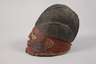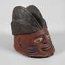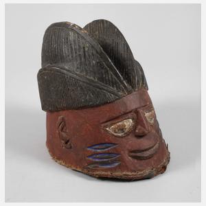 Westafrika, Volk der Yoruba, 20. Jh., tropisches Hartholz, beschnitzt und mehrfarbig gefasst, Helmmaske mit gedrungenen männlichen Gesichtszügen, verziert von Tatauierungen, gefächerte Haartracht, innen Reste originalen Textilbesatzes, Altersspuren, H 22 cm.
