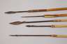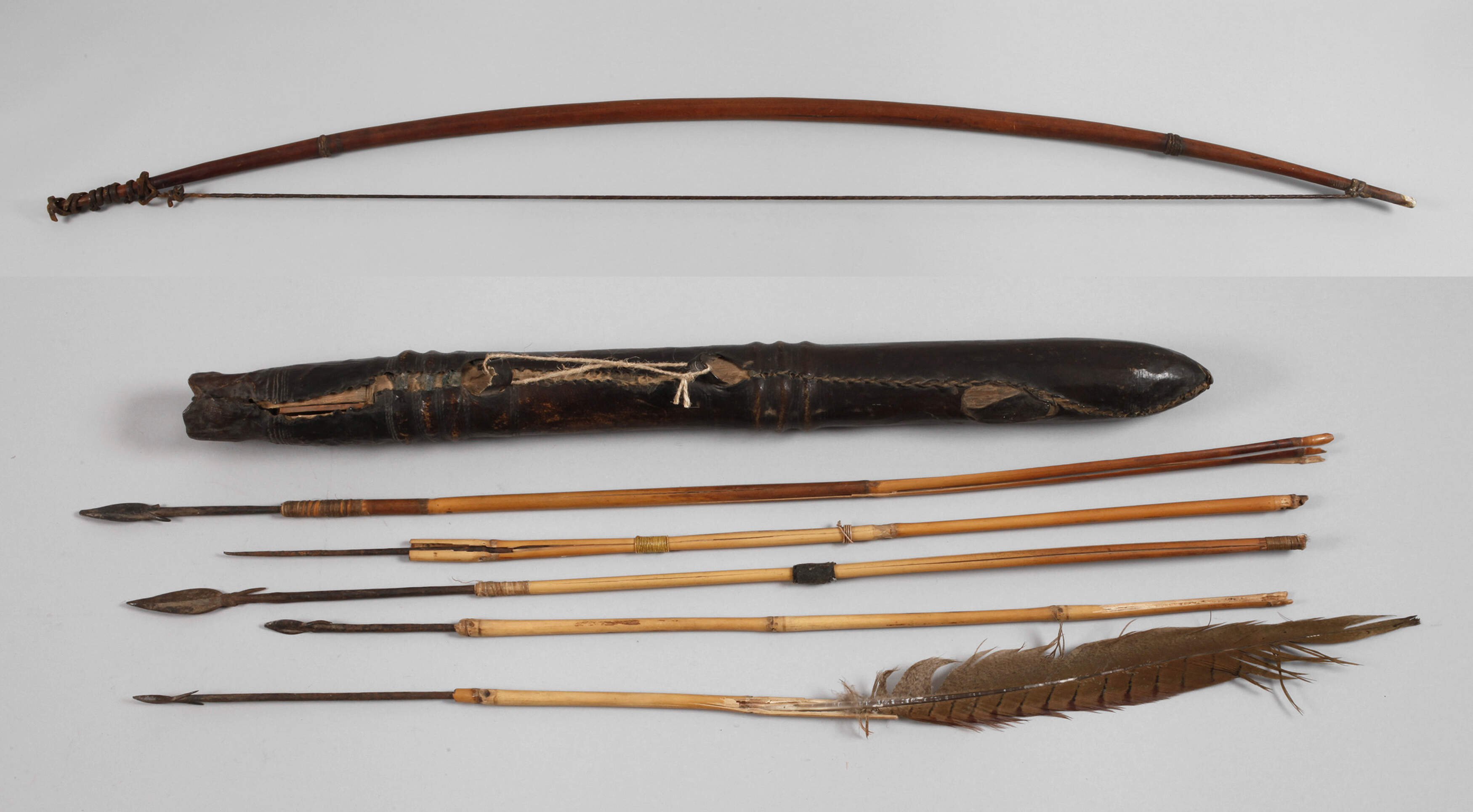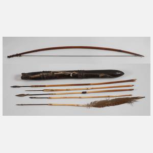 20. Jh., stabiler Hartholzbogen mit originaler Lederbespannung, aufwendig gearbeiteter Köcher mit Lederverzierungen, dazu fünf Bambuspfeile mit geschmiedeten Widerhakenspitzen, Erhaltungsmängel, L Bogen 160 cm, L Köcher 52 cm.