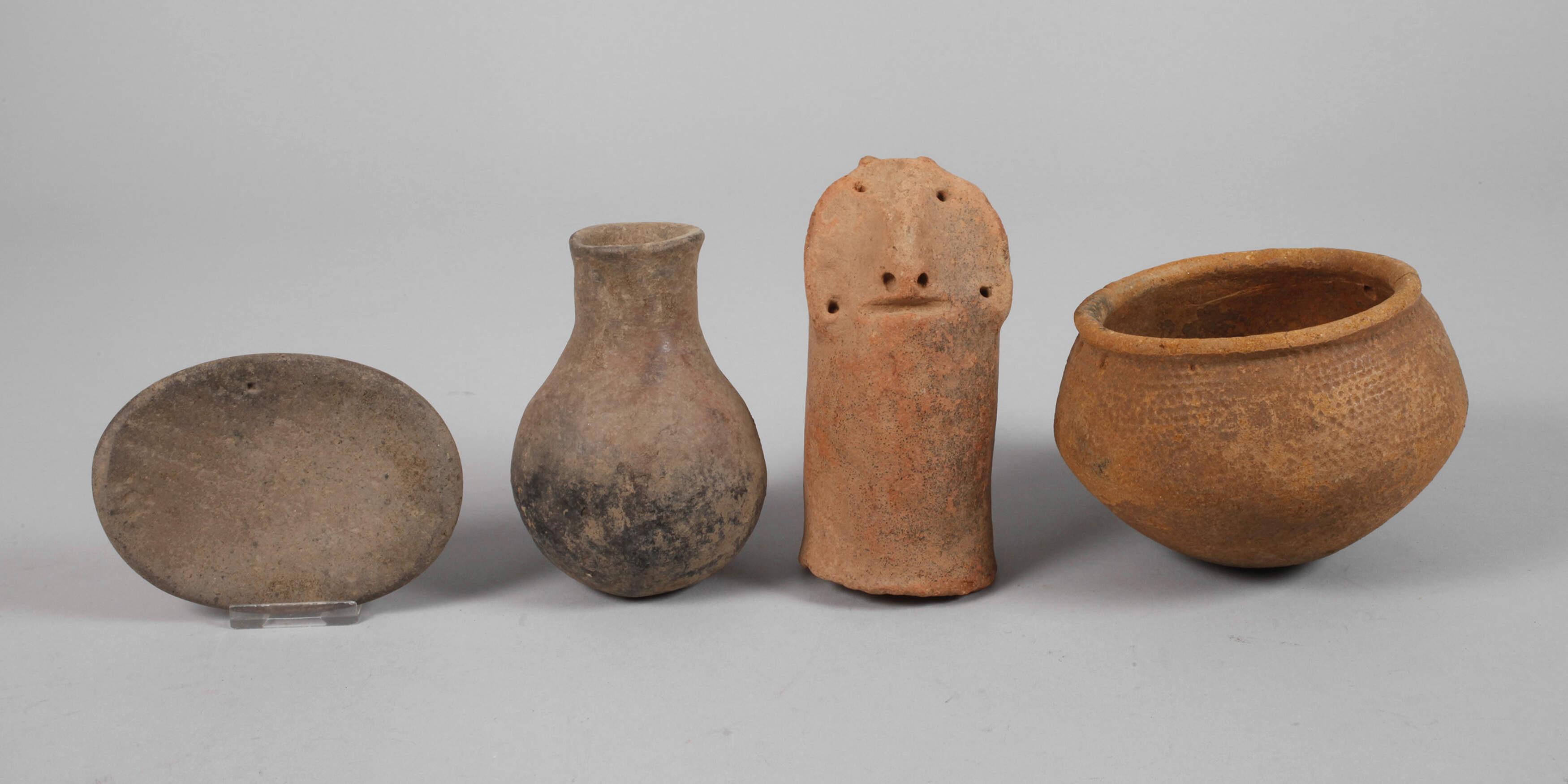 20. Jh., dabei abstrakter Terrakottakopf sowie kleine Terrakottaschale, beide Bura-Kultur/Niger, dazu kleine Schale und bauchige Vase, Sao-Kultur/Tschad, unterschiedliche Maße und Erhaltungen, L max. 15 cm.