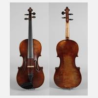 mit Zettel Johann Georg Thier, Lauten- und Geigenmacher in Wien 1747, sowie Zettel Anton Widmann in Wien 1972 (Reparatur), angeschäftet, schöner brauner Lack, alt repariert, spielbereiter Zustand, dazu zwei Bögen, ein Silberbogen gestempelt R. Hageman sowie Neusilberbogen gestempelt Roderich Paesold, spielbereit, im Kasten, L Korpus 39 cm.
