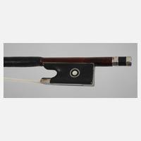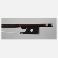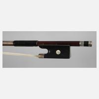 1. Hälfte 20. Jh., undeutlich brandgemarkt A. Thomae, facettierte Tropenholzstangen mit Umwicklung aus Leder und Silberdraht, Frosch aus Ebenholz mit eingesetzten Zierelementen aus Perlmutt sowie Silbermontierungen, leichte Alters- und Gebrauchsspuren, laut Info vom Einlieferer durch Bogenmacher überholt und gerichtet, L ca. 74 cm, G ca. 59 g.