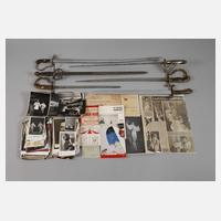 Mitte 20. Jh., dabei Schaltknauf aus Bakelit in Hornoptik, in originalem Etui, dazu Schatulle aus Mahagoni mit aufgelegter reliefierter Automobildarstellung, sieben Nadeln Mercedes und VW sowie zwei weitere Embleme und ein Lesezeichen, unterschiedliche Maße und Erhaltungen, L max. 18 cm.