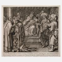 vier Arbeiten aus einer größeren Folge mit vielfigürlicher Darstellungen religiöser Themen, unter der Darstellung, in der Platte jeweils in Latein bezeichnet, Radierungen, um 1660, rechts unten in der Platte signiert "Petrus Aquila del. sculp.", um Einfassungslinie mindestens kleines Papierrändchen, unterschiedliche Erhaltungen, Darstellungsmaße einschl. Schrift max. ca. 25 x 29 cm. Künstlerinfo Pietro Aquila: italienischer Maler, Zeichner und Kupferstecher (um 1630 Marsala bis 1692 Alcamo), Schüler der Accademia di San Luca bei Pietro del Pó, um 1780 Rückkehr nach Sizilien, Quelle: Thieme-Becker und Internet.