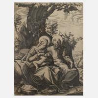 die am Fuße eines Baums sitzende Maria, dem Jesuskind fürsorglich die Brust gebend und an ihrer Seite Josef, großformatiger Kupferstich auf schwachem Bütten, Mitte 16. Jh., unten mittig im Druck bezeichnet und datiert "Battista Parmen. formis. Roma 1588" (formis = Besitzer der Druckplatte), schöner, klarer, gratiger Abzug, Papier gleichmäßig gebräunt und minimal fleckig, teils innerhalb der Einfassungslinie beschnitten, hinter Kunststoffscheibe gerahmt, Blattmaße ca. 44 x 33,8 cm. Künstlerinfo: ital. Künstler (um 1524 Ala bei Verona bis 1587 Innsbruck) über die Ausbildung des Künstlers ist nichts bekannt, ab 1562 im Dienst von Kaiser Ferdinand I., ab 1572 für Ferdinand II. tätig, 1573 Gestaltung der Fresken im Ballspiel Burg, ab 1575 Hofmaler von Ferdinand II., Ausstattung der Silbernen Kapelle der Hofkirche zu Innsbruck, 1586 Gestaltung einer Holzdecke auf Schloss Ambras, Quelle: Thieme-Becker und Wikipedia.
