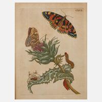 Distelblüte mit Raupen und Faltern, original erschienen 1717 in „der Raupen wunderbare Verwandelung und sonderbare Blumennahrung.", hier kolorierter Kupferstich aus der Mitte des 18. Jh., rechts oben Nummer der Tafel "CXVI", Papier gebräunt, in Passepartout und unter Glas gerahmt, Plattenmaße ca. 15,5 x 11,5 cm. Künstlerinfo: dt. Malerin und Enthomologin (1647 Frankfurt/Main bis 1717 Amsterdam), jüngstes Kind von Matthäus Merian den Älteren, lernte schon im Kindesalter die verschieden Drucktechniken im Betrieb des Vaters kennen, ihr Stiefvater Jacob Marell weckte bei ihr das Interesse an der Blumenmalerei, 1675/80 veröffentlichte sie ihr dreibändiges „Neues Blumenbuch“, 1679 erschien ebenfalls in Nürnberg “Der Raupen wunderbare Verwandelung“, seit 1691 in Amsterdam ansässig, ab 1699 zweijährige Forschungsreise nach Surinam, als Ergebnis ihrer Forschung erschien „ Metamorphosis Insectorum Surinamensium“, eines der bedeutendsten Werke der frühen Naturwissenschaft, Quelle: Thieme-Becker, Wikipedia und Internet.