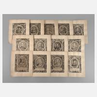 13 Blatt aus einer größeren Folge, jeweils mit dem Bildnis einer Persönlichkeit, umrandet von ihren Namen und meist Angabe der Lebensdaten, Kupferstiche, um 1600, je auf Unterlagekarton kaschiert, bis zum Darstellungsrand beschnitten, teils leichte Erhaltungsmängel, Darstellungsmaße ca. 24,2 x 17,7 cm.