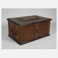17. Jh., Eiche massiv, teils geschwärzt, schlichter Korpus mit scharniertem Deckel, dieser mit zentraler erhabener Kassette mit intarsiertem Sternmotiv, gerahmt von Flammleisten, umlaufend verziert von dekorativen schmiedeeisernen, durchbrochen gearbeiteten Bändern, seitlich zwei c-förmige Handhaben, das Innenleben mit zwei Beiladen, die innenliegenden Eisenbänder mit roter Farbfassung, originaler Schlüssel, Altersspuren, restaurierungsbedürftig, Maße 26 x 51 x 35 cm.