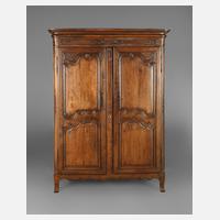 Frankreich, 2. Hälfte 18. Jh., Eiche massiv, feststehender zweitüriger Korpus, mit floraler Oberflächenschnitzerei verziert, originale Eisenbeschläge, alt restauriert, Schloss ergänzt, Alters- und Gebrauchsspuren, Maße 186 x 140 x 59 cm. Provenienz: nach Angaben des Einlieferers aus der Sakristei Notre Dame in Rouen/Frankreich.